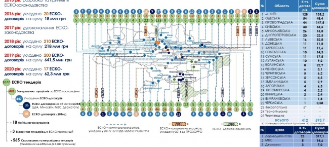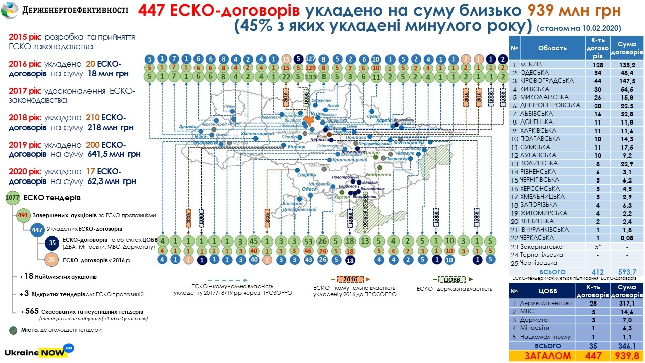Так, станом на початок лютого 2020 р. в Україні укладено 447 ЕСКО-договорів вартістю близько 940 млн грн на здійснення енергоефективних заходів у школах, дитсадках, лікарнях та інших закладах соціальної сфери.