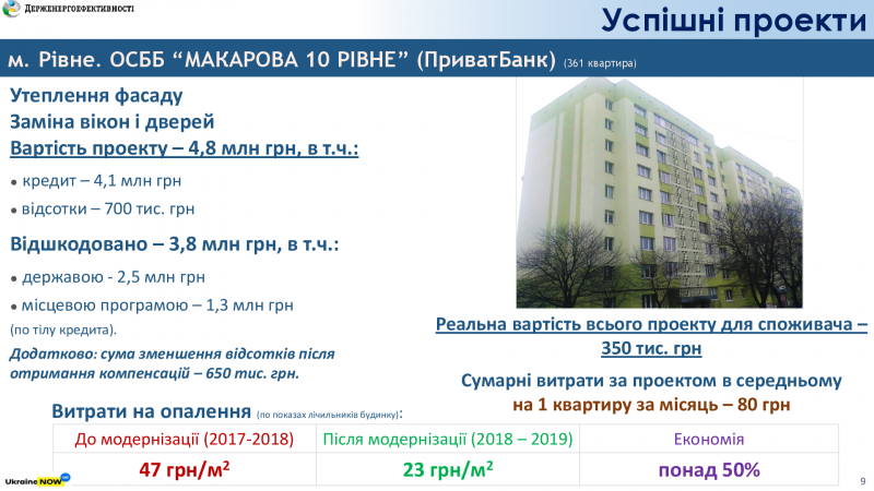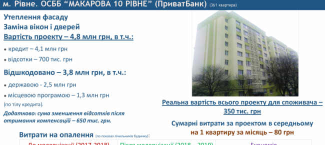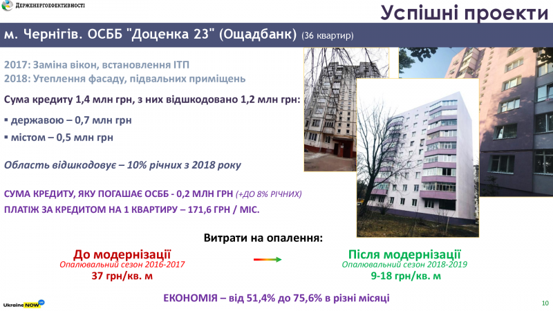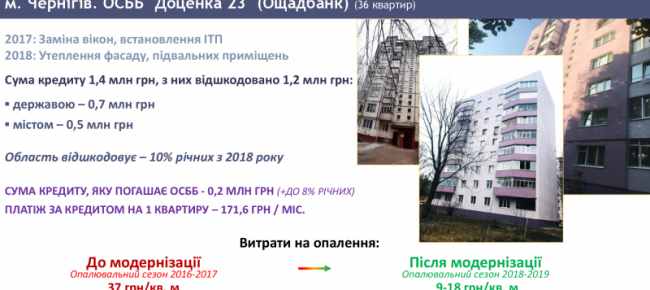 Наприклад, ОСББ «Доценка 23» (м. Чернігів) залучило «теплі кредити» на загальну суму 1,4 млн грн, щоб встановити ІТП, замінити вікна, утеплити фасад та підвали. За результатами усіх компенсацій із державного, обласного та міського бюджетів загальна сума відшкодування склала 1,2 млн гривень. Тобто обсяг витрат ОСББ за кредитом – близько 200 тис. гривень. При цьому, завдяки енергоефективним заходам рахунки за опалення зменшилися на 50%.