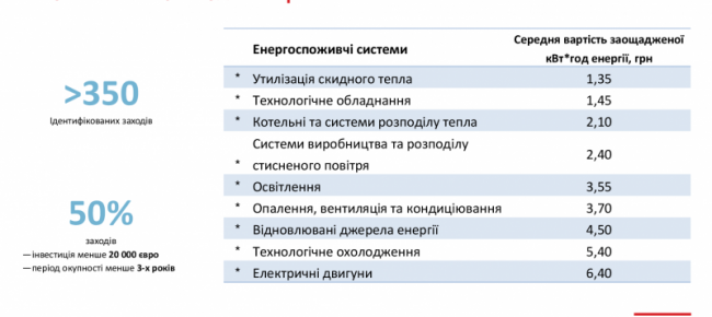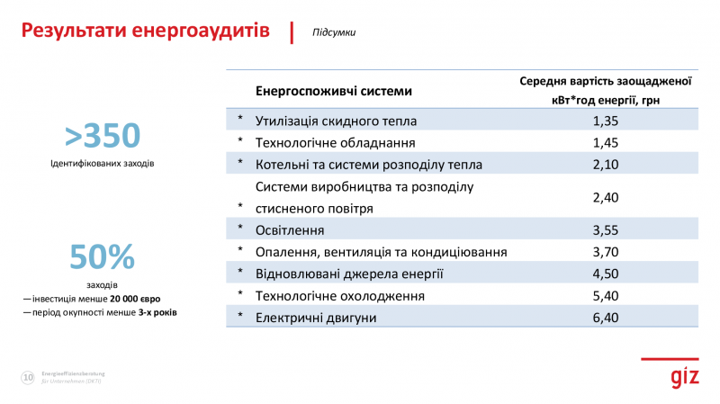 «У рамках Проекту ми провели енергоаудити на понад 60 підприємствах малого та середнього бізнесу у 4-х галузях: хлібопекарська та молочна промисловість, машинобудування та виробництво неметалевих будівельних матеріалів. За результатами енергоаудитів було визначено більше 350 дієвих заходів з енергоефективності для підприємств. Також ми ранжували їх за обсягом потенційної економії. Це цінна інформація та орієнтир для компаній», - прокоментувала Н. Усенко, координатор зазначеного Проекту GIZ, та додала, що компанії також обмінюються досвідом між собою у рамках створених Мереж енергоефективних підприємств.