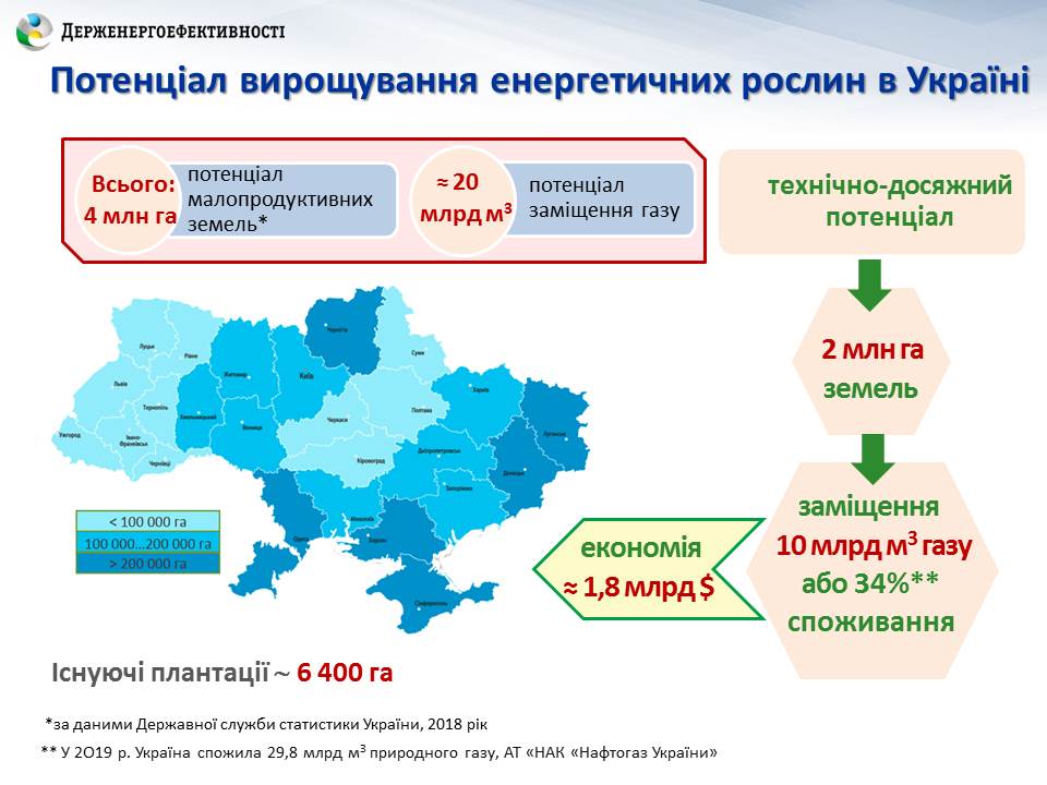 «Енергетичні рослини – важливе джерело сировини для генерації енергії. Використання врожаю енергокультур із 4 млн га малородючих земель дозволить заміщувати в еквіваленті до 20 млрд м3 газу у рік», - прокоментував важливість цього напряму т.в.о. Голови Держенергоефективності Костянтин Гура.