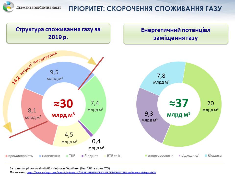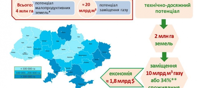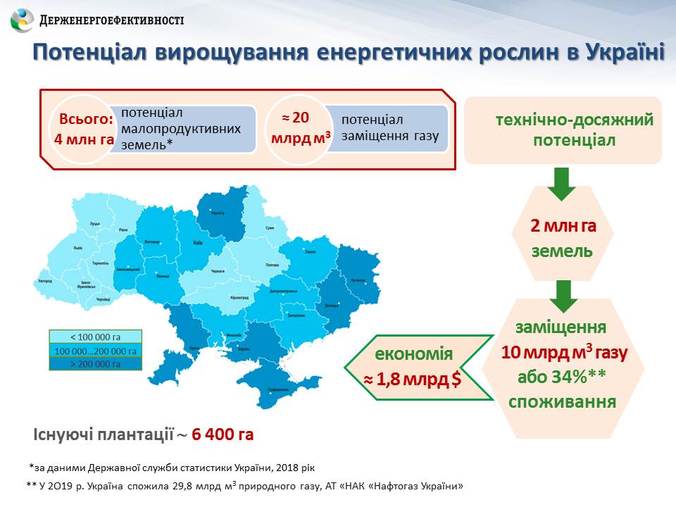 Як пояснив Ю. Шафаренко, енергетичні рослини – значний, досі неохоплений ресурс для заміщення газу: «За даними НАК «Нафтогаз», у 2019 р. Україна спожила близько 30 млрд м3 газу. Щоб зменшити залежність від блакитного палива, необхідно розвивати біоенергетичні проєкти. Так, за оцінками експертів, врожай енергетичних рослин із 4 млн га малородючих земель та його використання в енергетичних цілях може замістити в еквіваленті близько 20 млрд м3 газу у рік».