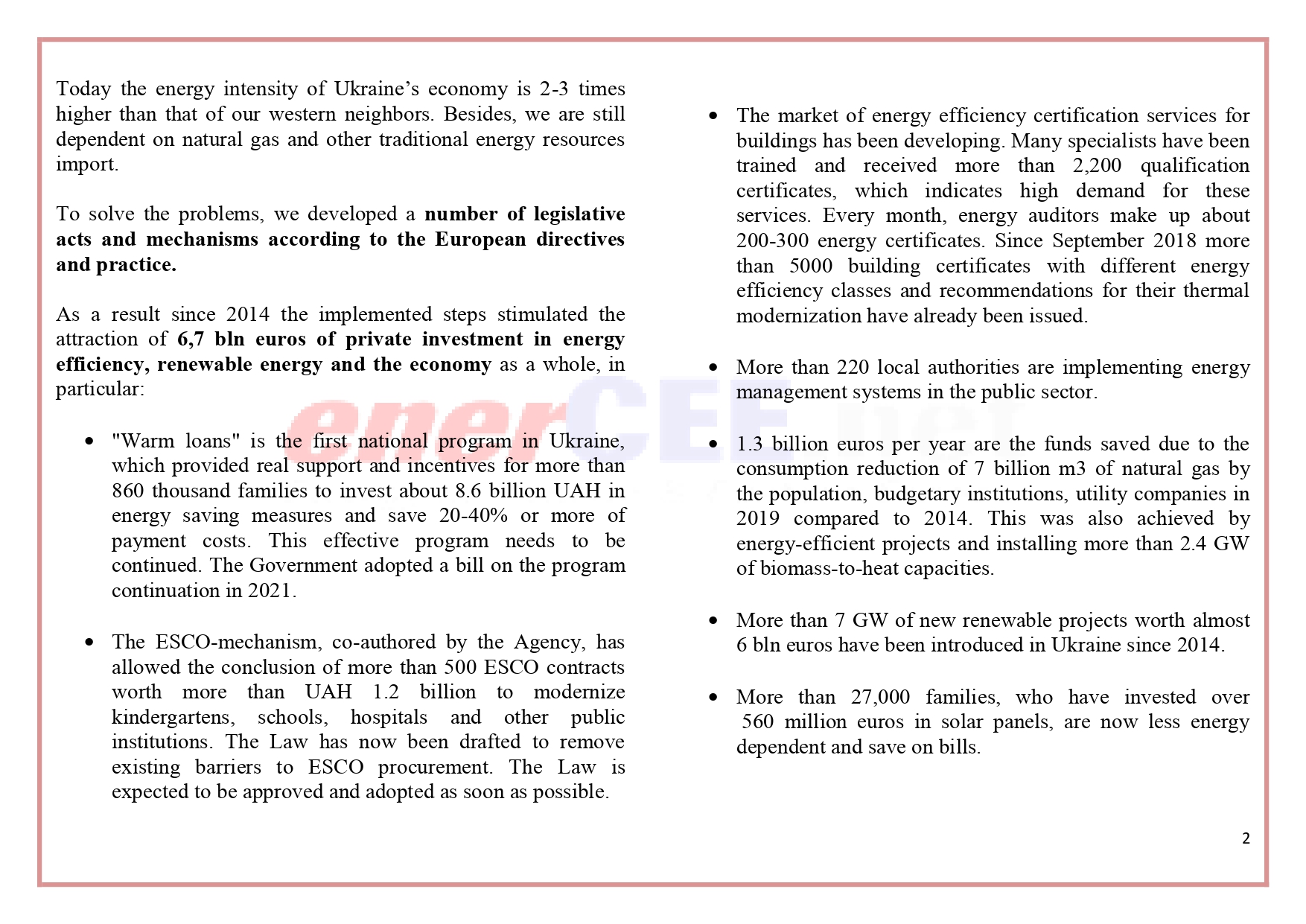 «На сьогодні рівень енергоємності нашої економіки залишається в середньому у 2 рази вищим, ніж у країнах ЄС. При цьому є значний потенціал енергозбереження. Тому для нас важливо забезпечити крос-секторальний розвиток сфери енергоефективності», - повідомив К.Гура і додав, що спільно з Міненерго напрацьовано цілу низку ініціатив для різних секторів економіки.