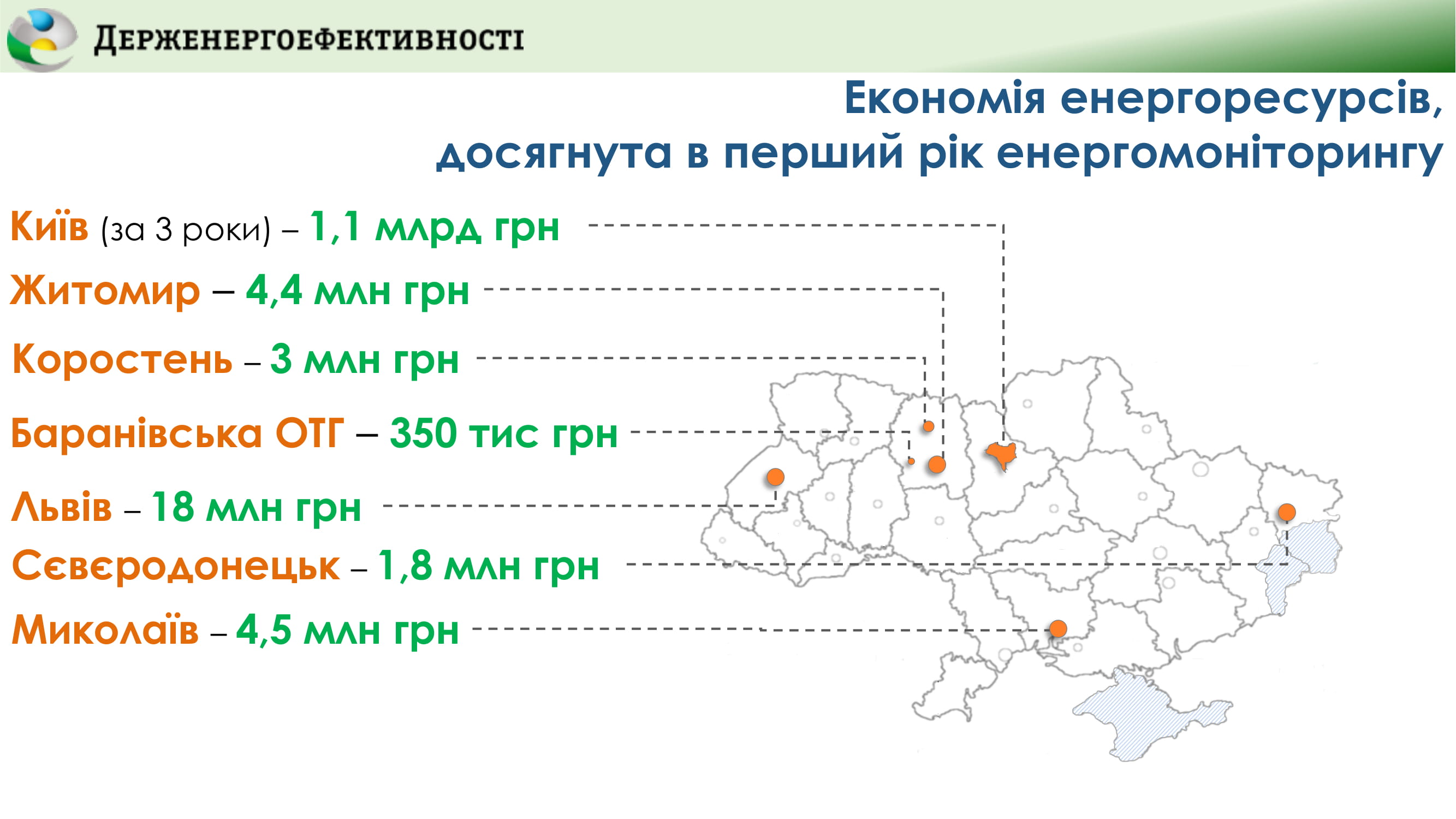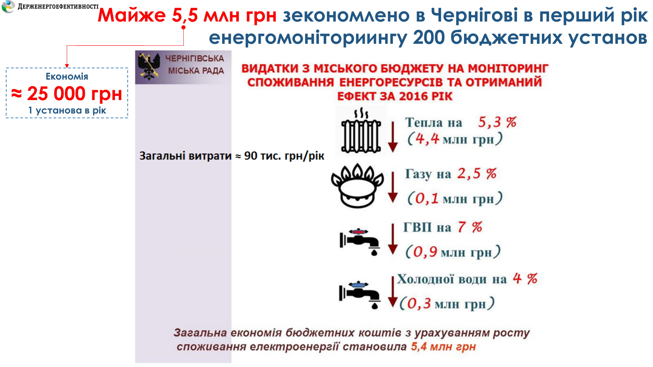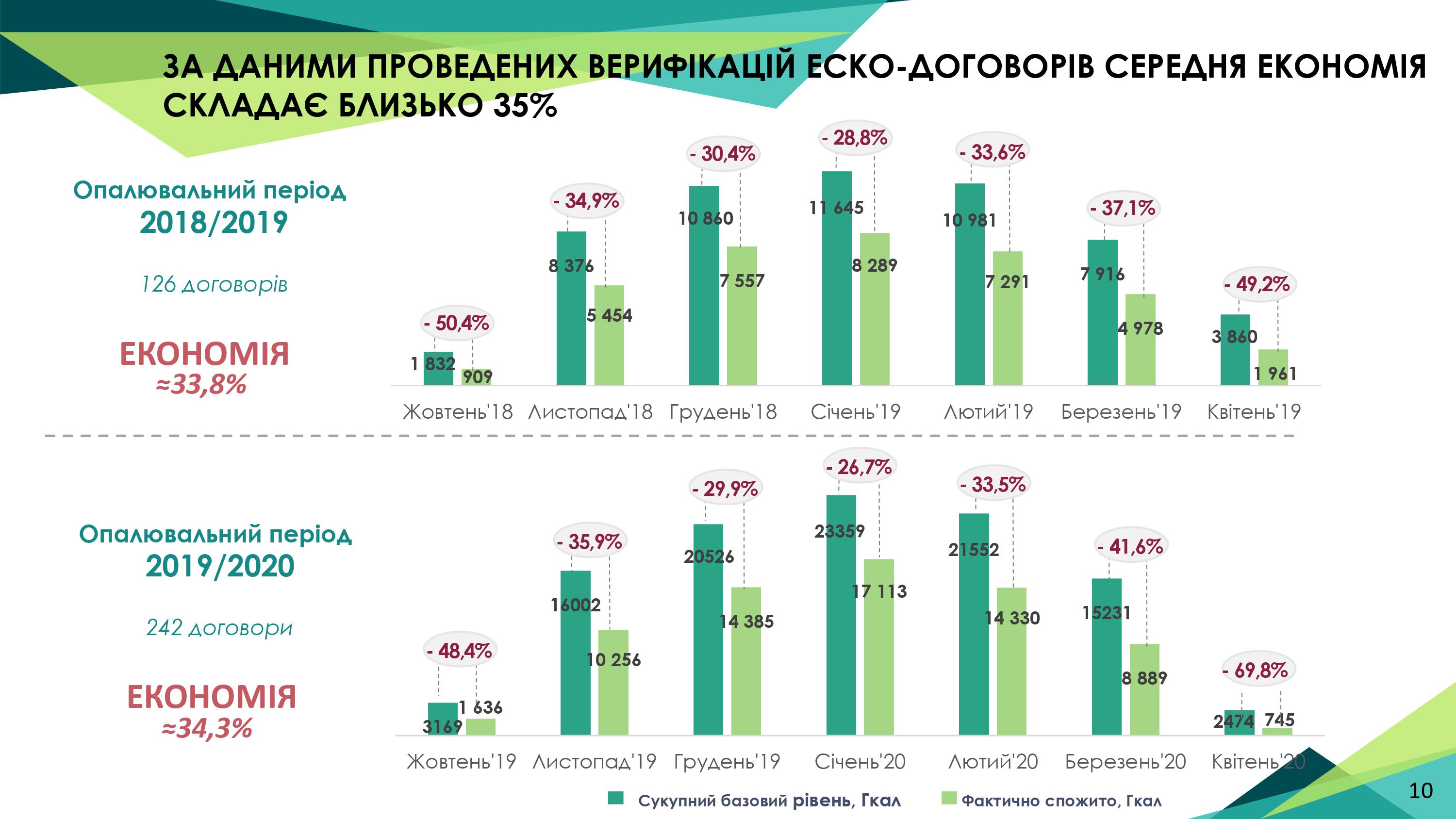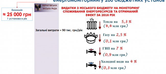 Для бюджетної сфери є ЕСКО-механізм, завдяки якому в країні за кошти інвесторів модернізується понад 500 бюджетних установ. Загальна вартість ЕСКО-контрактів – близько 1,2 млрд гривень. Середня річна економія – 35%.