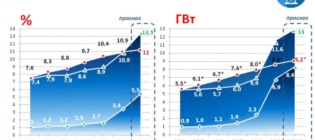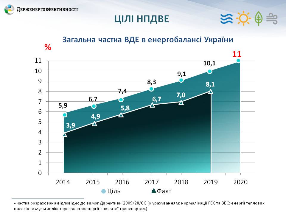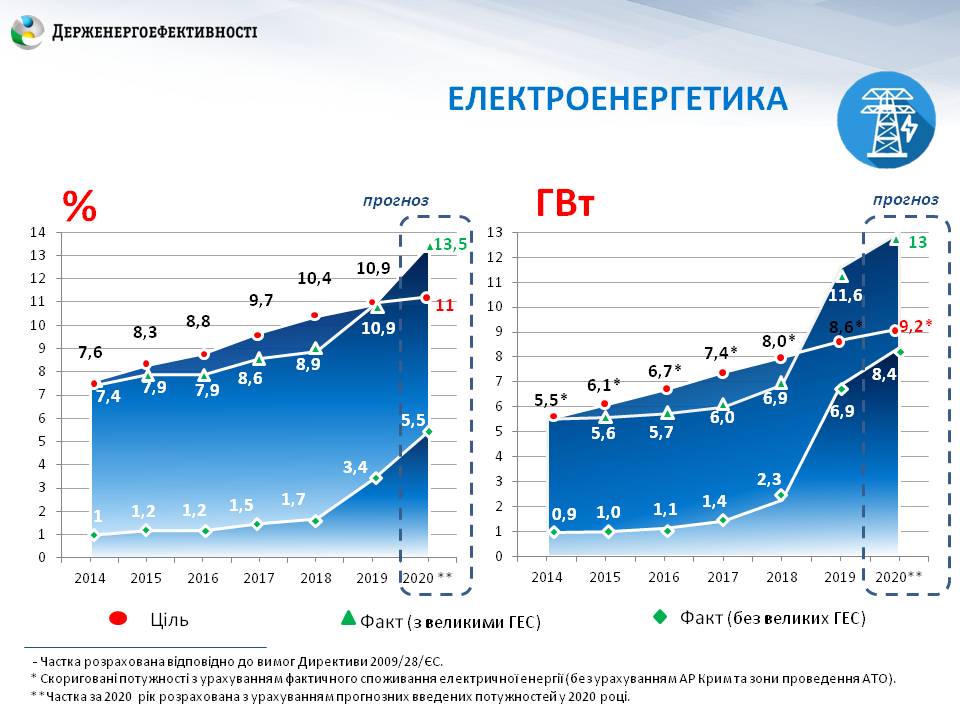 Завдяки введенню у 2020 році близько 1,5 ГВт об’єктів відновлюваної електроенергетики, прогнозується, що частка енергії з ВДЕ у споживанні електроенергії у 2020 році перевищить ціль НПДВЕ на 2 % та складе близько 13%.
