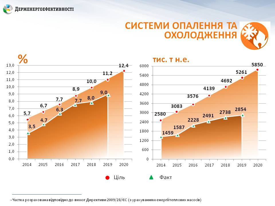 На кінець 2019 р. частка енергії з відновлюваних джерел в опаленні склала 9%, що на 1% більше порівняно із 2018 роком.