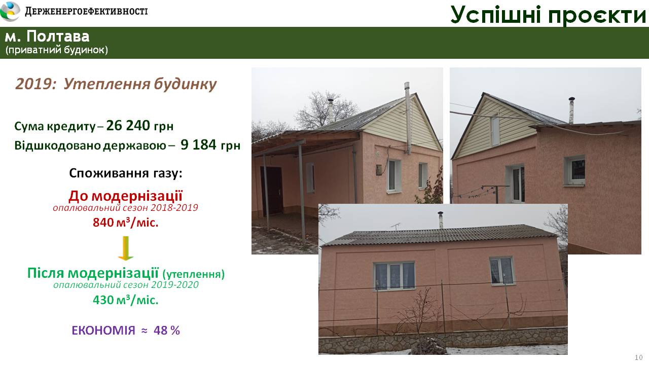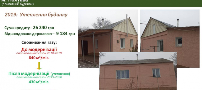 До прикладу, приватне домогосподарство на Полтавщині залучило ≈ 26 тис. грн. на утеплення будинку, а держава повернула 9 тис. гривень.