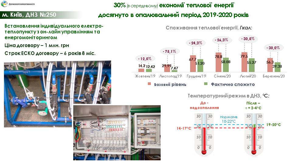 Інший приклад – підвищення енергоефективості у дитячому садочку № 250 в м. Києві за ЕСКО-договором. У закладі встановлено індивідуальний електро-теплопункт з онлайн-управлінням та енергомоніторингом. Із жовтня 2017 року надаються послуги з енергосервісу.