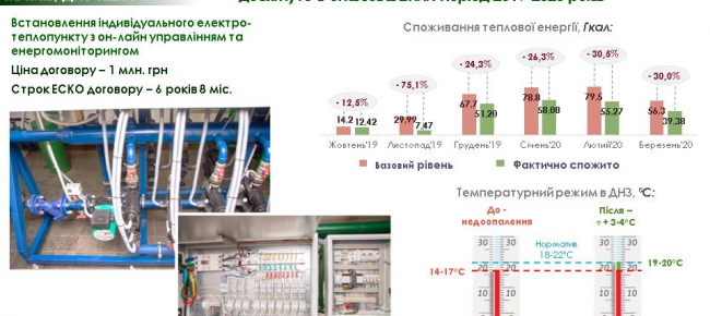 У рамках реалізованих заходів за опалювальний сезон 2019/2020 рр. вдалось досягти в середньому 30% економії теплової енергії. Більше того, зазначене технічне рішення дозволило підняти температурний режим на 3-4 градуси до 19-20 °С.
