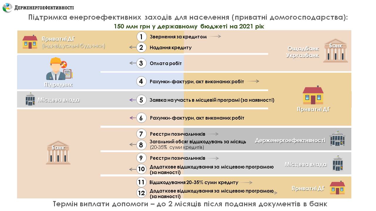 - 35 % - на енергоефективні заходи у приватних будинках;