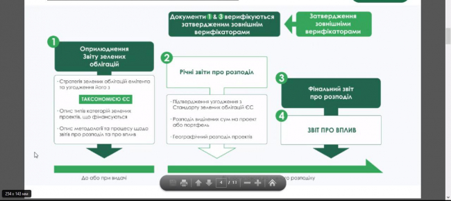 Під час презентації Ірина Ставчук звернула особливу увагу на глобальні трансформації фінансових ринків, в яких все більше уваги приділяється екологічним ризикам, а також на визначення європейських зелених облігацій та вимоги Положення ЄС про таксономію.