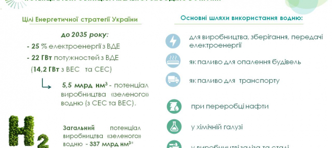 Ще один перспективний напрям, розвиток якого дозволить Україні стати менш енергозалежною та гідним енергетичним партнером ЄС– це водень. Потенціал виробництва водню із відновлюваних джерел енергії до 2035 року сягає 5,5 млрд нм3 у рік. Загальний - 337 млрд нм3. Наразі розробляється Стратегії розвитку водневої енергетики України до 2050 року.