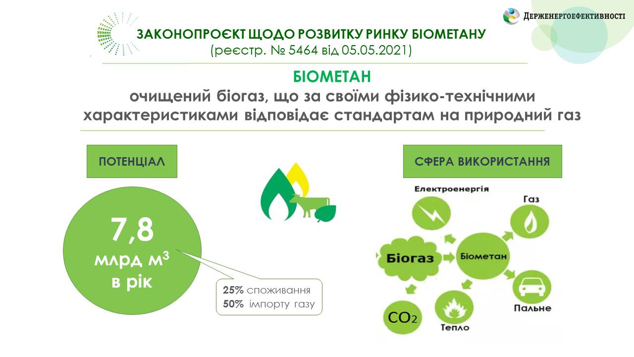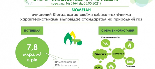 Держенергоефективності з Міненерго та БАУ розробили законопроєкт щодо розвитку ринку біометану. Цю ініціативу підтримали народні депутати. Так, у Парламенті зареєстровано проєкт Закону № 5464 від 05.05.2021 (автор - Andrii Zhupanyn)