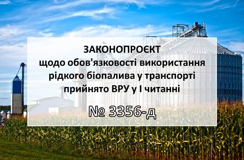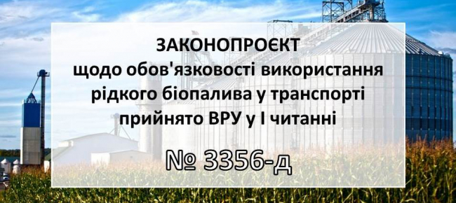 30 06 2021На засіданні Парламенту схвалено у першому читанні за основу законопроєкт № 3356-д від 05.11.2020 щодо обов'язковості використання рідкого біопалива (біокомпонентів) у галузі транспорту: http://w1.c1.rada.gov.ua/pls/zweb2/webproc4_2?id=&pf3516=3356-%D0%B4&skl=10.