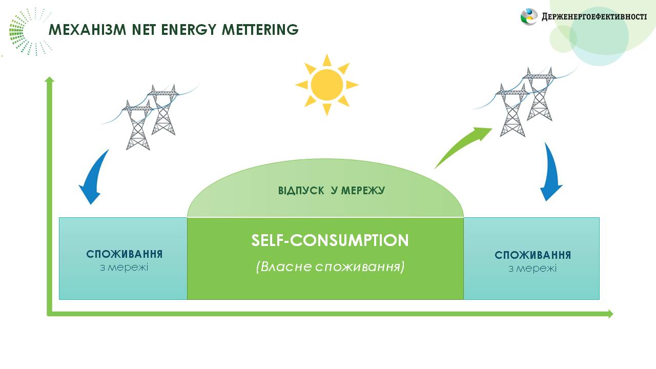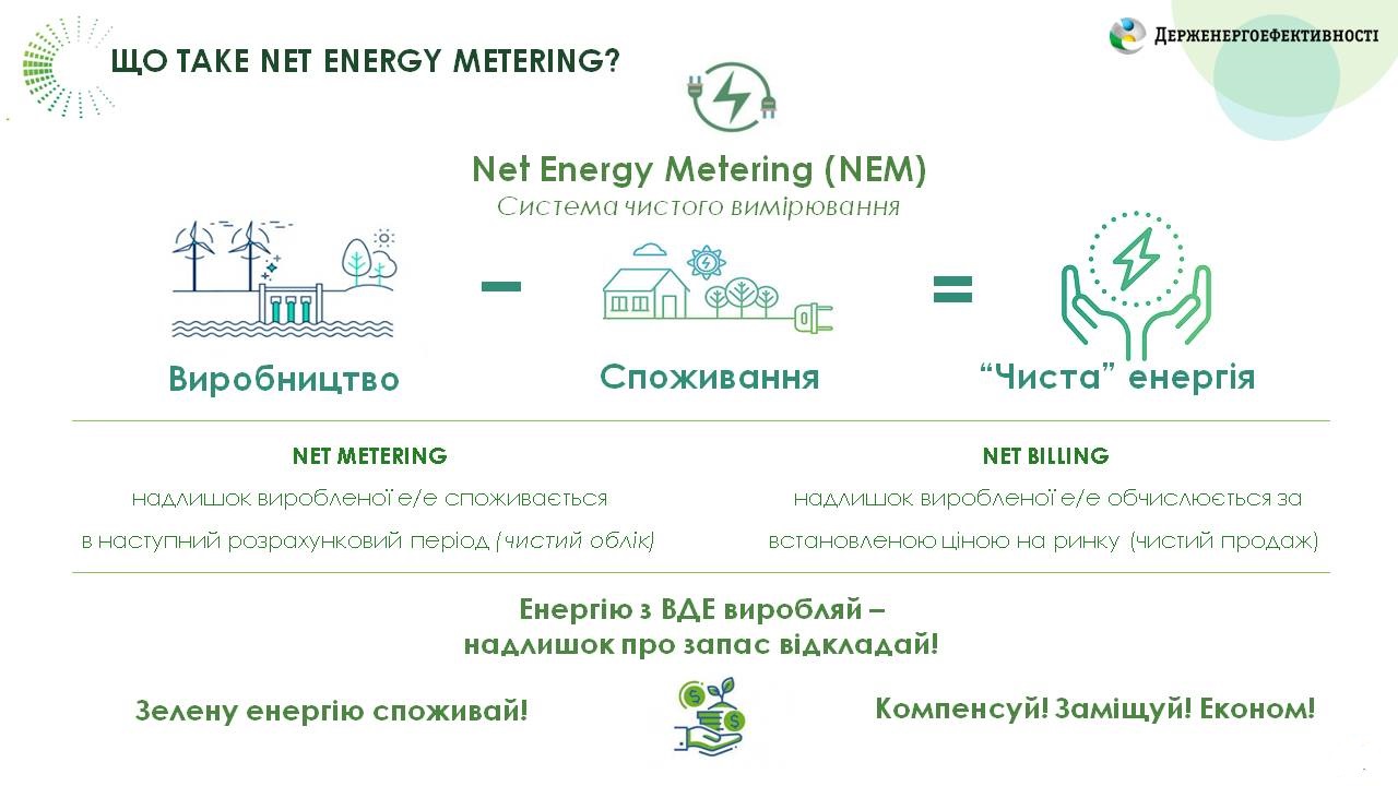 Ідея Net Metering полягає у тому, що підприємство може виробляти та споживати електроенергію з відновлюваних джерел для власних потреб, а надлишок віддавати у мережу, щоб згодом за потреби використати у зручний час.