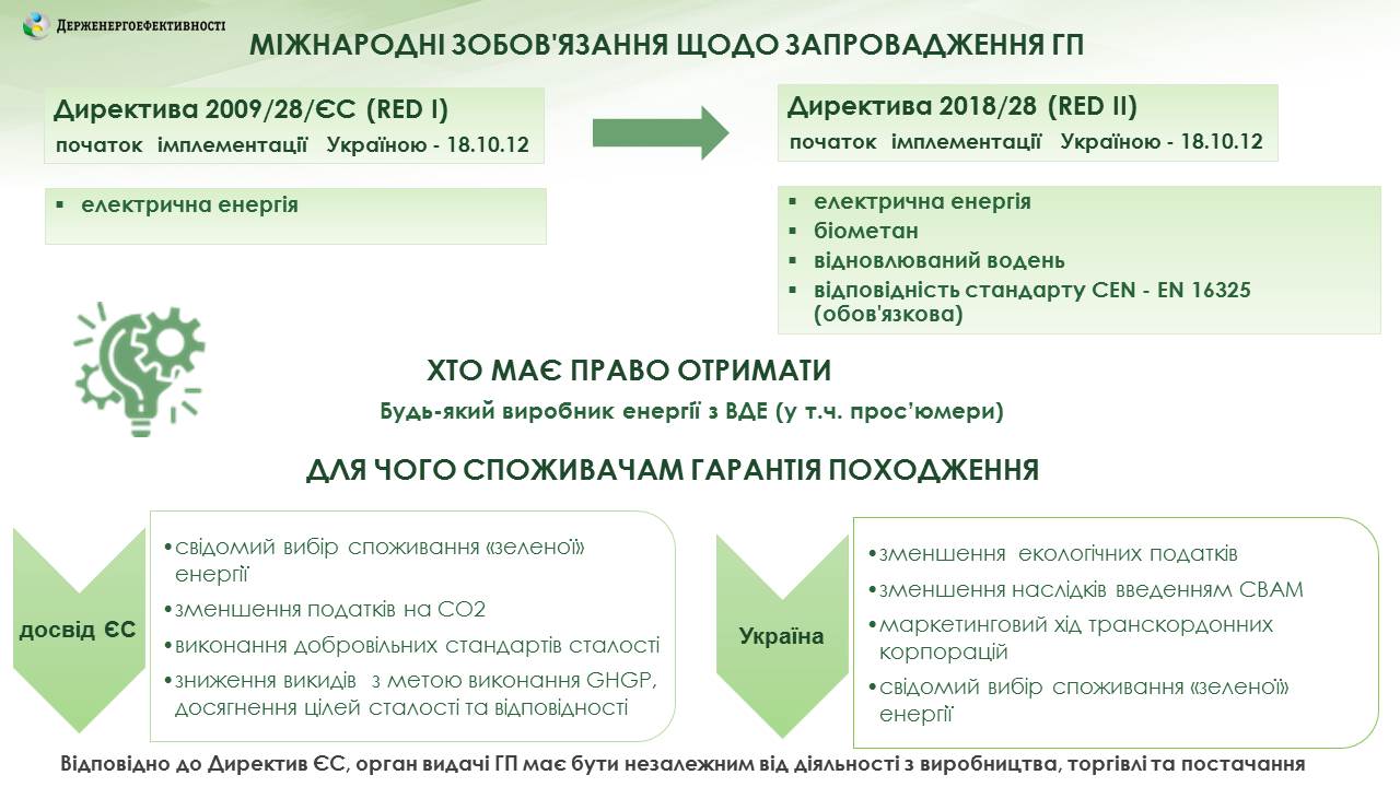 Важливою умовою є те, що українські гарантії походження мають відповідати європейському стандарту. Необхідними є розробка первинного і вторинного законодавства, вирішення питань програмного забезпечення, його фінансування, а також діалог з Енергетичним Співтовариством щодо взаємного визнання гарантій походження.
