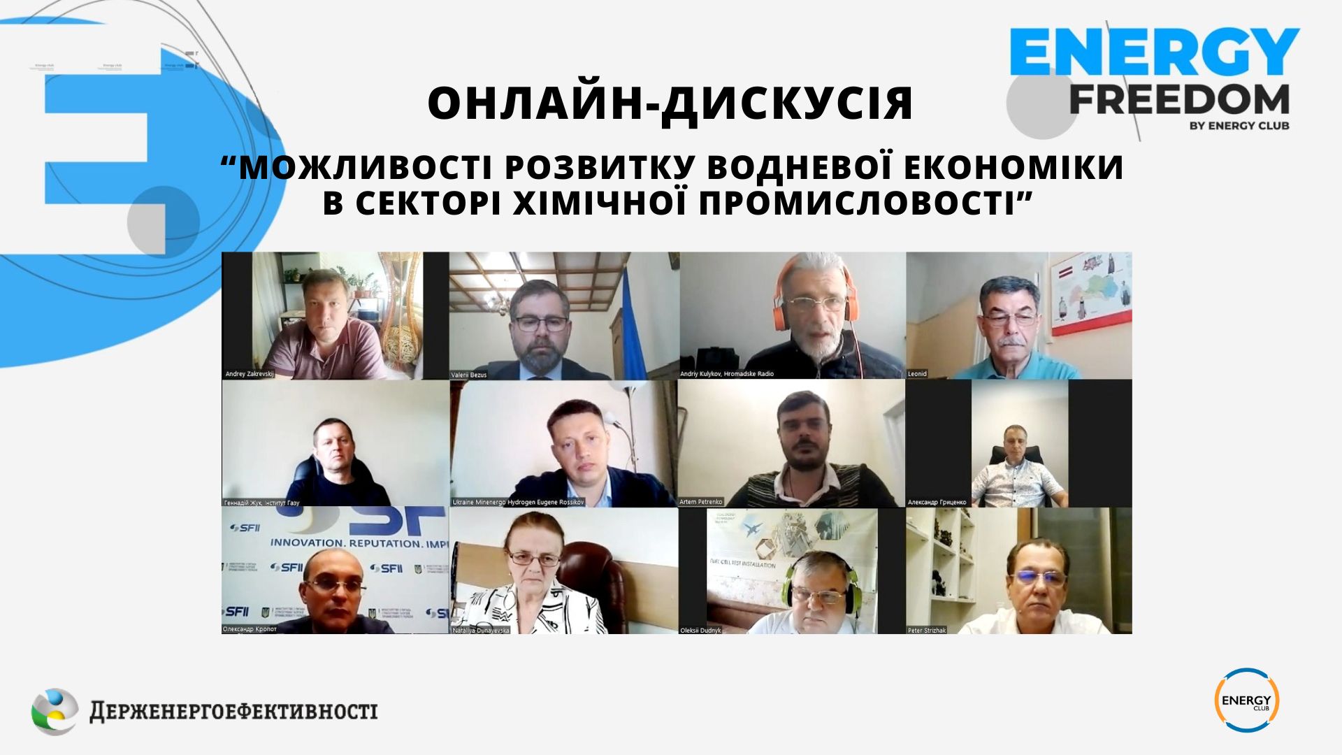 Пропозиціями щодо застосування водню поділилися представники Мінстратегпрому, Міненерго, Асоціації "Нафта та газ України", ТОВ «Хімічна технологічна компанія», Асоціації газовидобувних компаній України, Союзу хіміків України, Інституту газу, Інституту фізичної хімії ім. Л.В. Писаржевського та Інституту теплоенергетичних технологій НАН України.