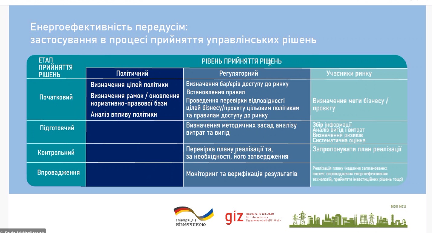 Учасники семінару отримали рекомендації щодо визначення факторів енергоефективності при прийнятті рішень, зокрема матрицю аналізу рішень на предмет відповідності цьому принципу та подолання можливих бар’єрів при його впровадженні в Україні.
