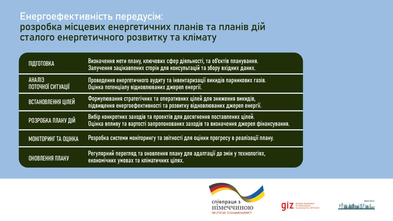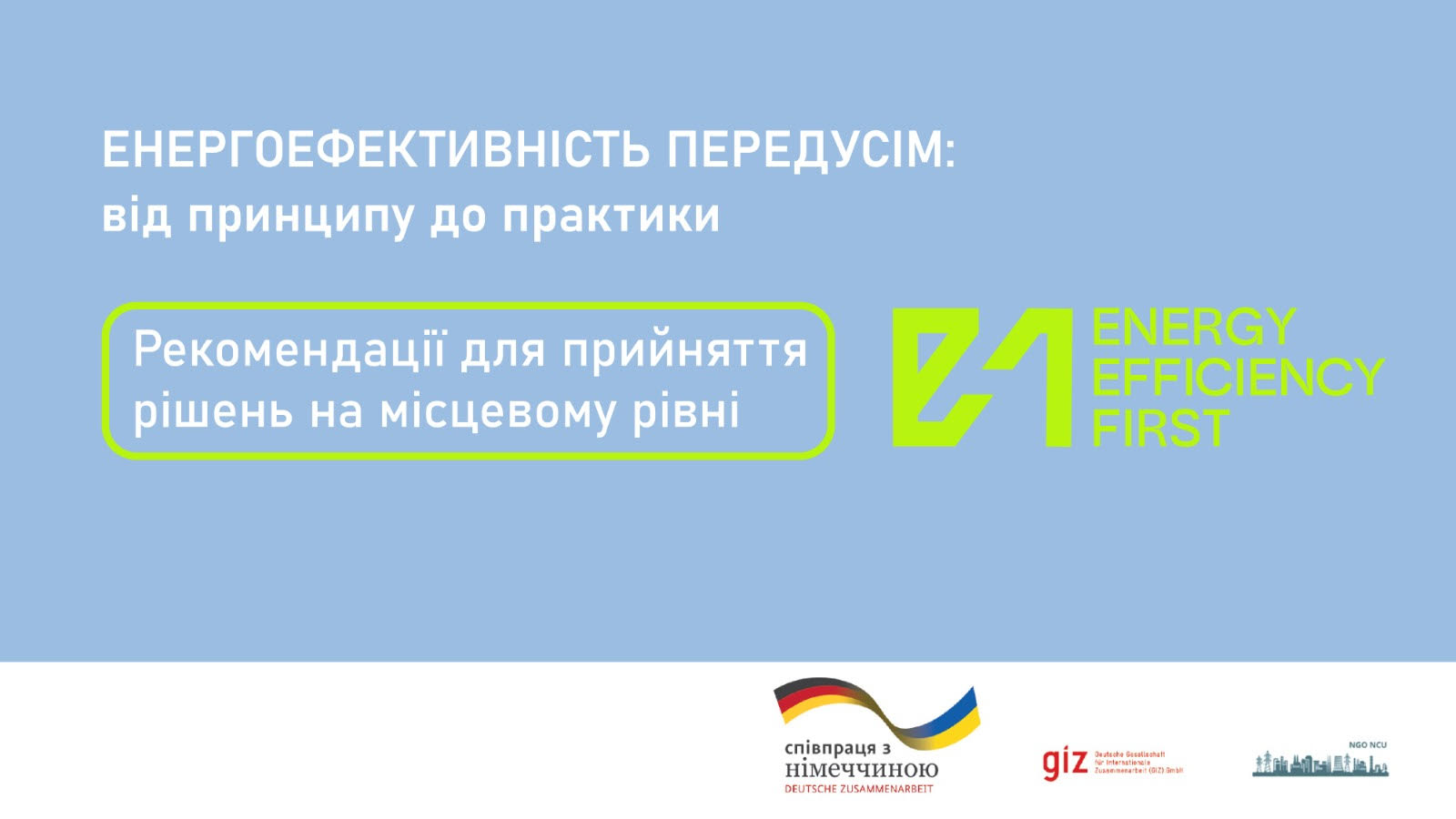 Нагадаємо, семінар відбувся за підтримки проєкту «Просування енергоефективності та імплементації Директиви ЄС про енергоефективність в Україні», що виконується GIZ за дорученням урядів Німеччини та Швейцарії. Організатори – громадська організація «Нова комунальна Україна у партнерстві з Держенергоефективності, Мінінфраструктури та Асоціацією міст України. Цей семінар – другий із серії заходів щодо сприяння інтеграції EE1st в український контекст. Перший вебінар вже відбувся для представників органів центральної виконавчої влади, наступний заплановано для підприємців та бізнесу.