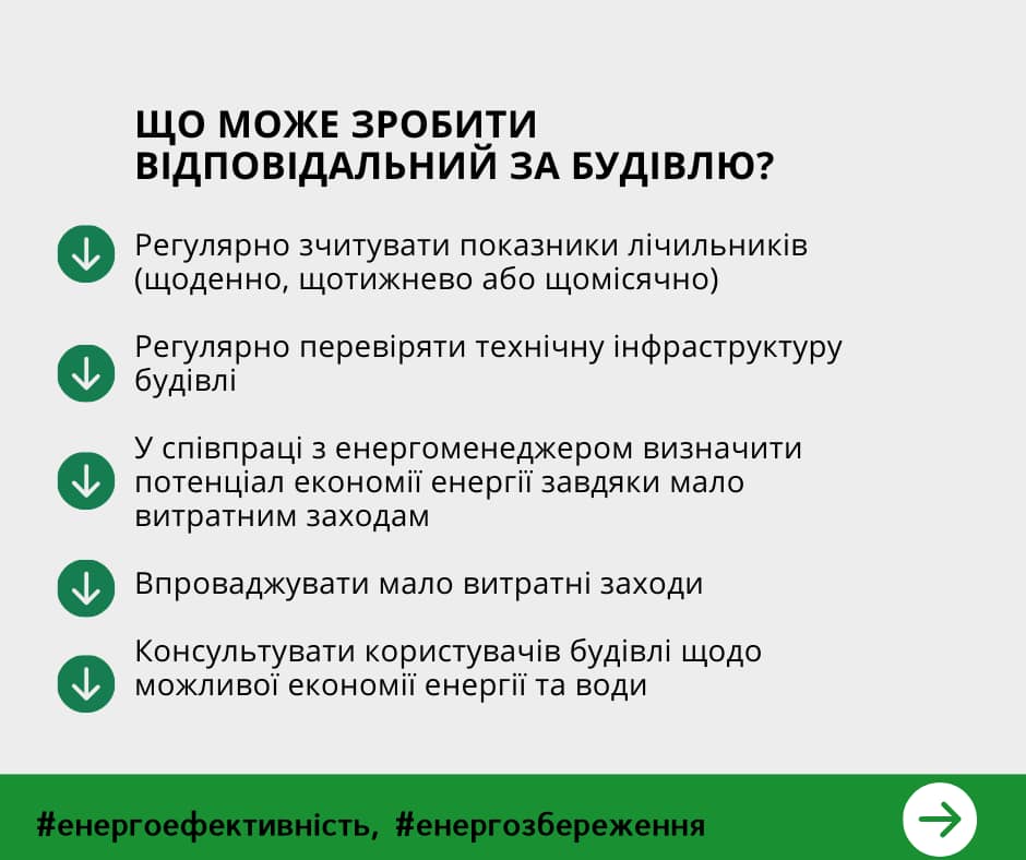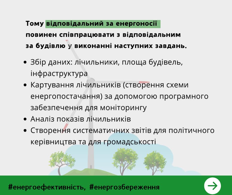 Тому муніципальний енергоменеджер або відповідальний за енергоносії повинен співпрацювати з відповідальним за будівлю у виконанні наступних завдань
