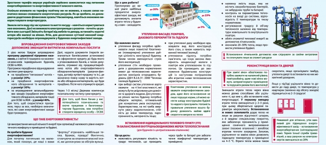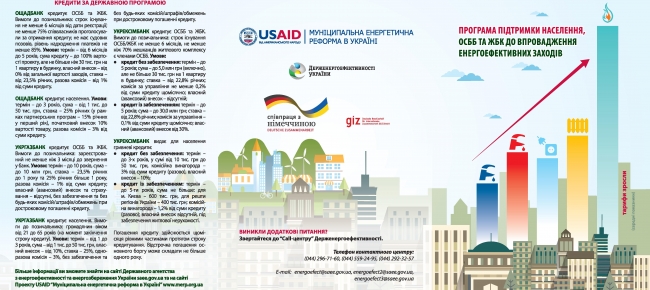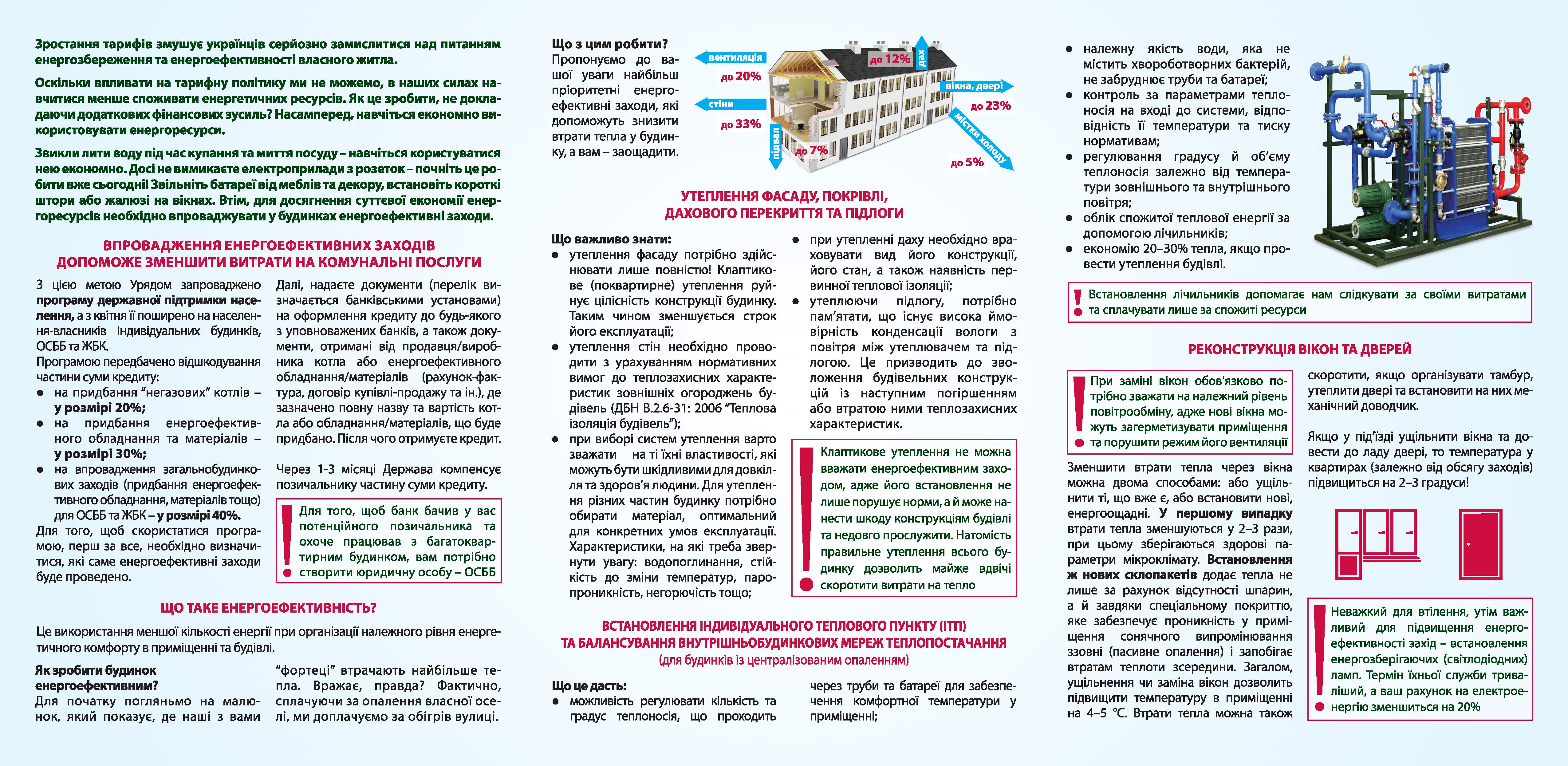 "Наш пріоритет – надати населенню легкий доступ до інформації про заходи з утеплення. Тому семінари, які ми ініціюємо у районних центрах країни, - це не єдина складова нашої роз’яснювальної кампанії. Нещодавно ми підготували брошуру для наших громадян. Інформація викладена чітко та просто. Описано зміст державної програми, переваги утеплення стін, дахів, заміни вікон, встановлення ІТП тощо, а також наведені умови кредитування банків за програмою з енергоефективності", - наголосив Голова Держенергоефективності Сергій Савчук та зазначив, що брошуру буде розповсюджено на різних публічних заходах, у тому числі на семінарах-практикумах в районних центрах України.