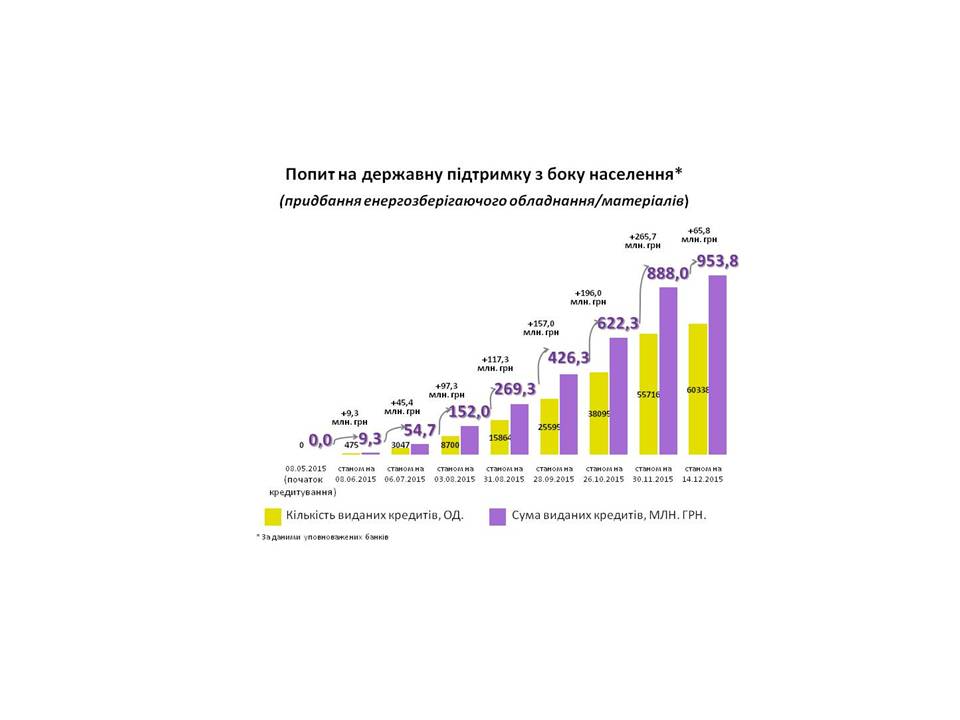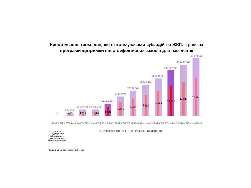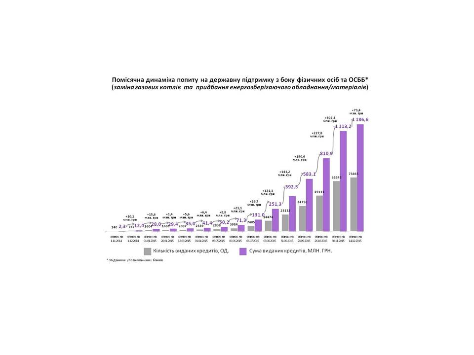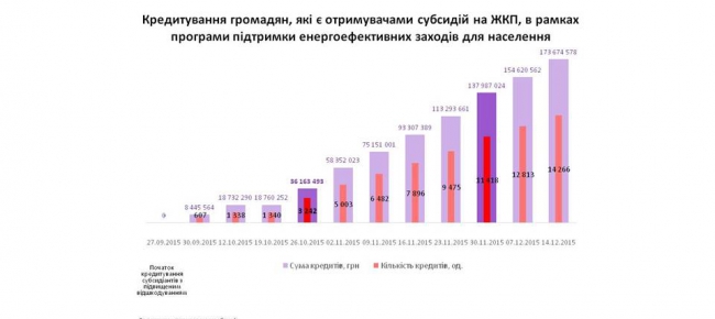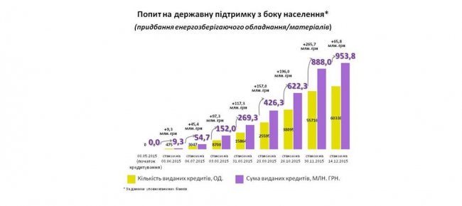 На придбання енергозберігаючого обладнання і матеріалів видано більше 60 тисяч кредитів, загальною сумою 953,8 млн.грн. Найбільш популярним заходом у цьому сегменті є заміна вікон та проведення термоізоляції.