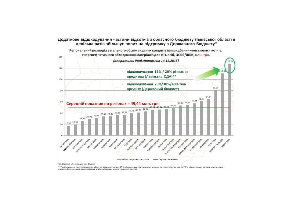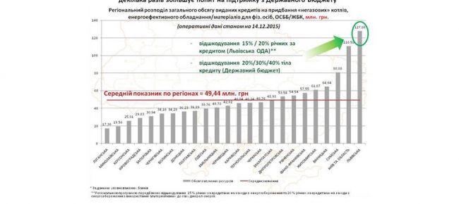 Найбільш активними споживачами «теплих» кредитів є мешканці Львівської та Київської областей, в яких станом на 14 грудня 2015 року, банками видано 127,9 млн.грн. кредитів та 110,6 млн.грн. відповідно.