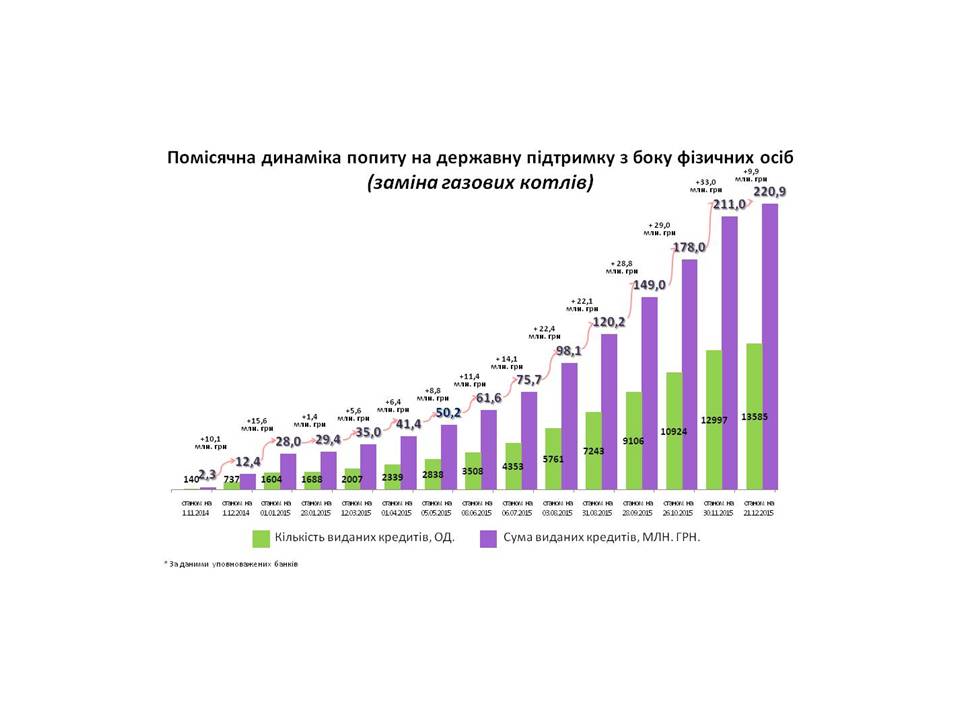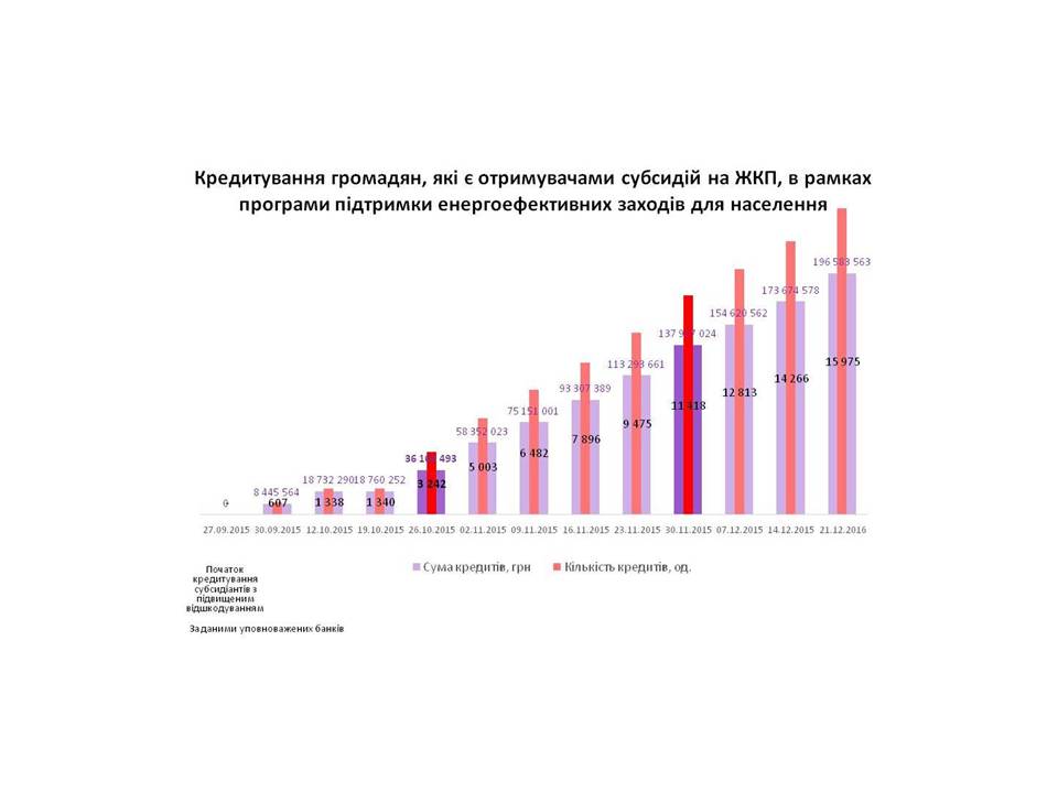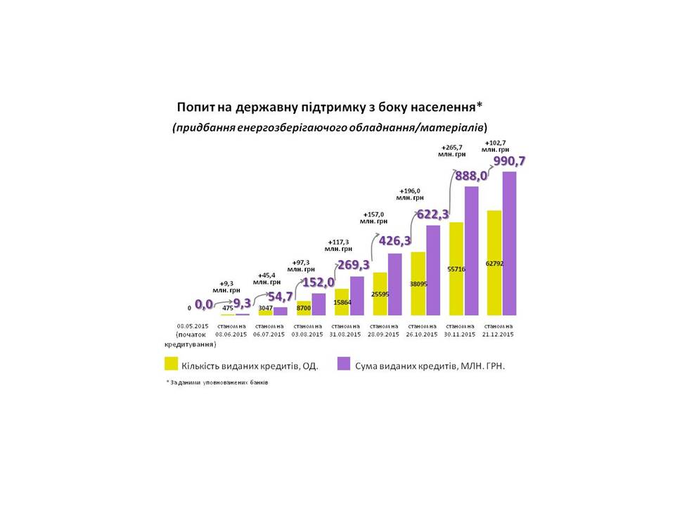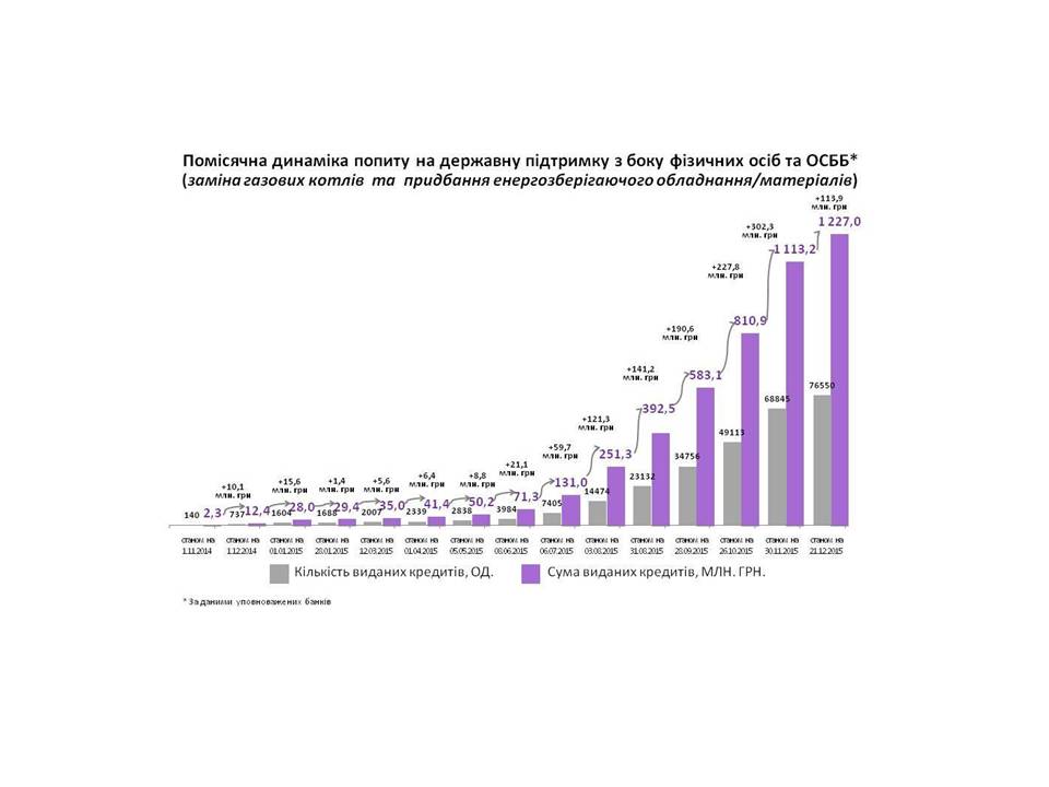 За результатами оперативного моніторингу станом на 21 грудня 2015 року банками видано близько 77 тисяч «теплих» кредитів на суму більше 1,2 млрд. грн. З них 40,4 млн.грн. лише за минулий тиждень.