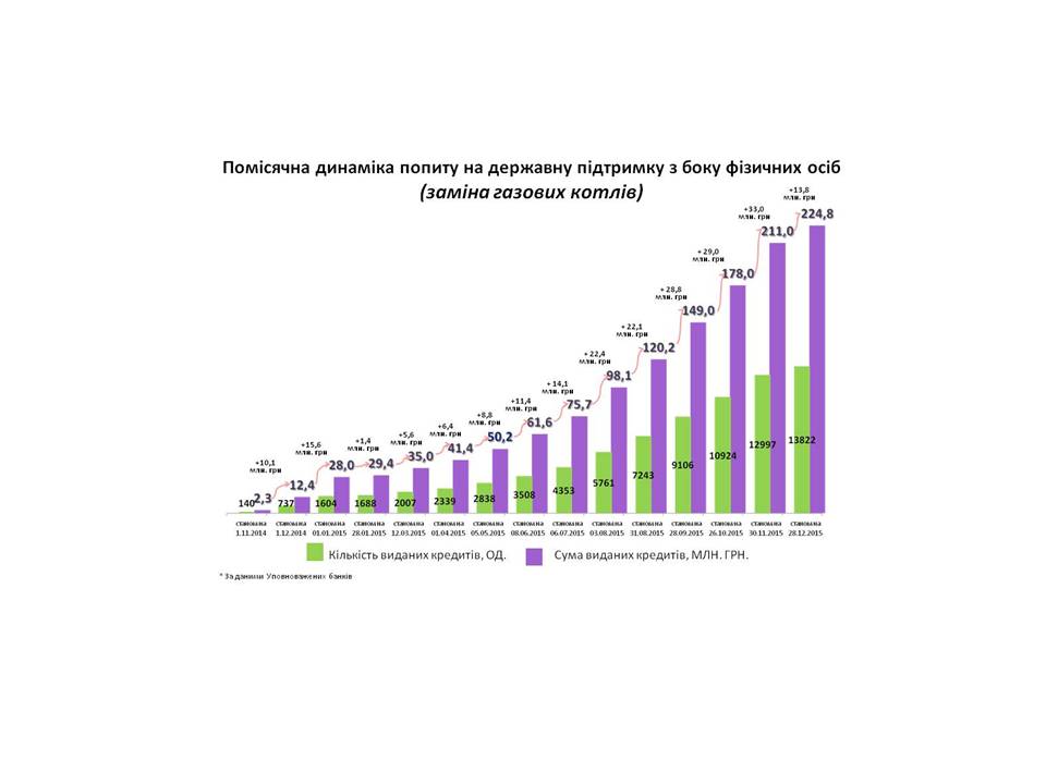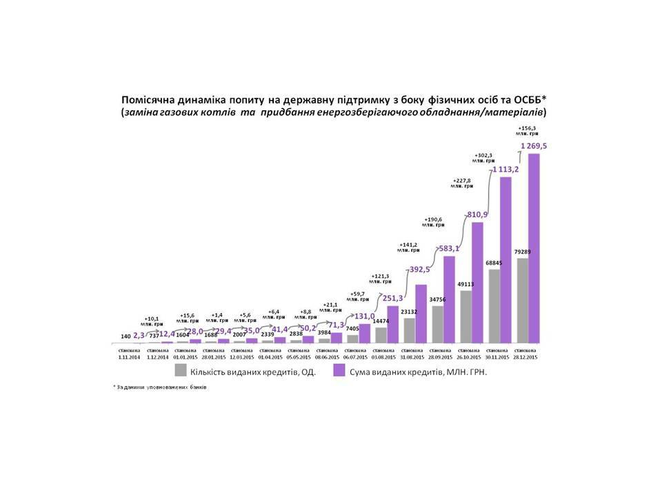 Всього, станом на 28.12.2015 р., на утеплення за державною програмою термодернізації будівель домогосподарствам видано кредитів на суму близько 1,3 млрд. грн. .